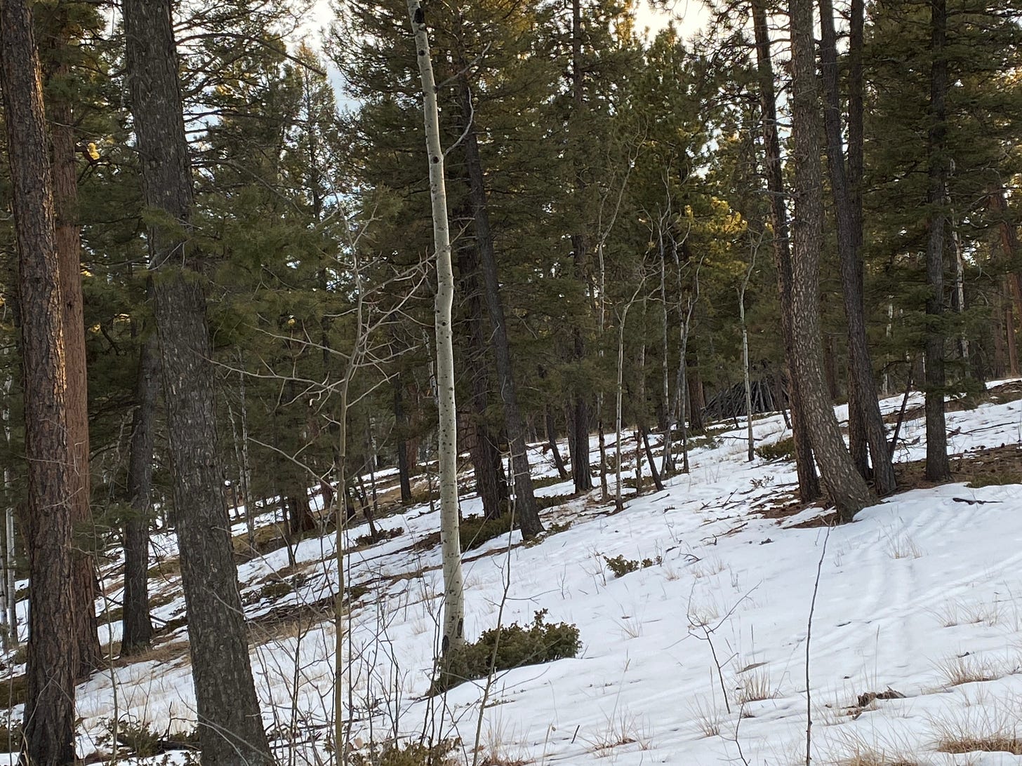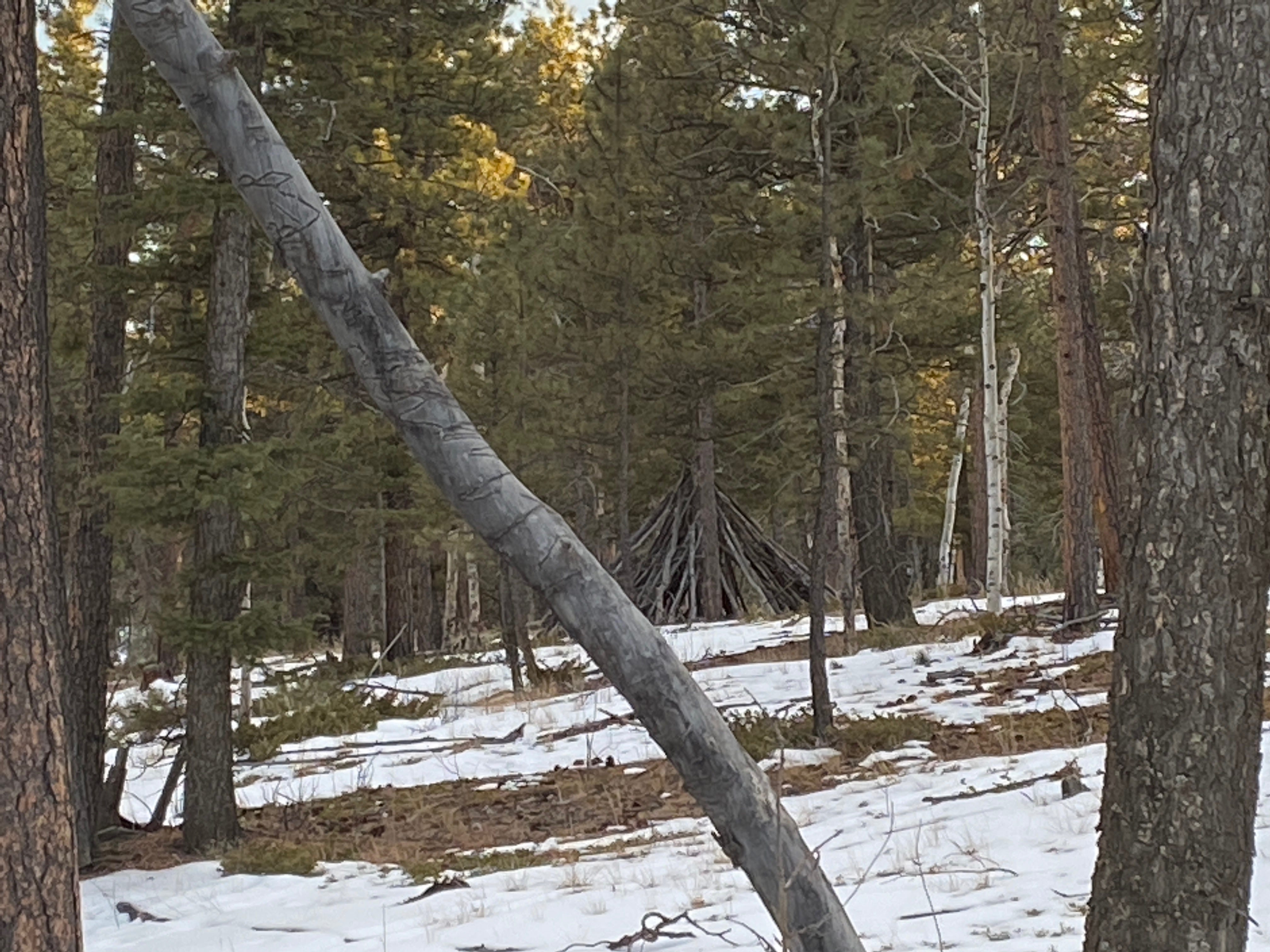 A couple of weeks later, we set out west of Divide, deep in Pike National Forest, ready to see what the woods might reveal. Sam walked beside me, binoculars slung around his neck, while the dog Caspian darted ahead, nose to the ground, chasing scents I couldn’t detect. The forest road stretched before us, and as we descended, I stopped to take in the view—rolling ridges and trees under a partly cloudy sky. The air was brisk but bearable thanks to all my layers.